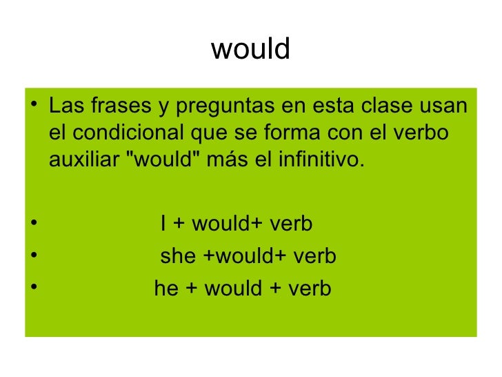 El auxiliar would, usado como condicional, expresa una idea de voluntad, de aceptación, de preferencia.